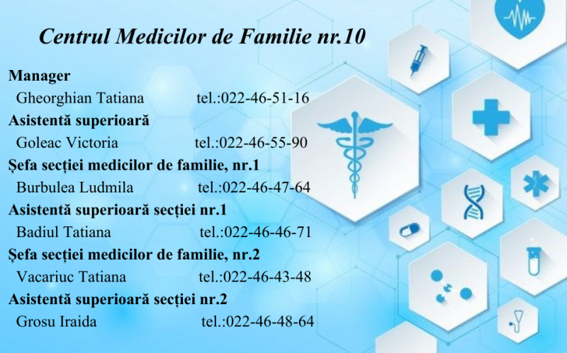 Graficul de lucru a medicilor de familie și a medicilor specialiști din cadrul Centrul Medicilor de Familie nr.10, al IMSP AMT Rîșcani