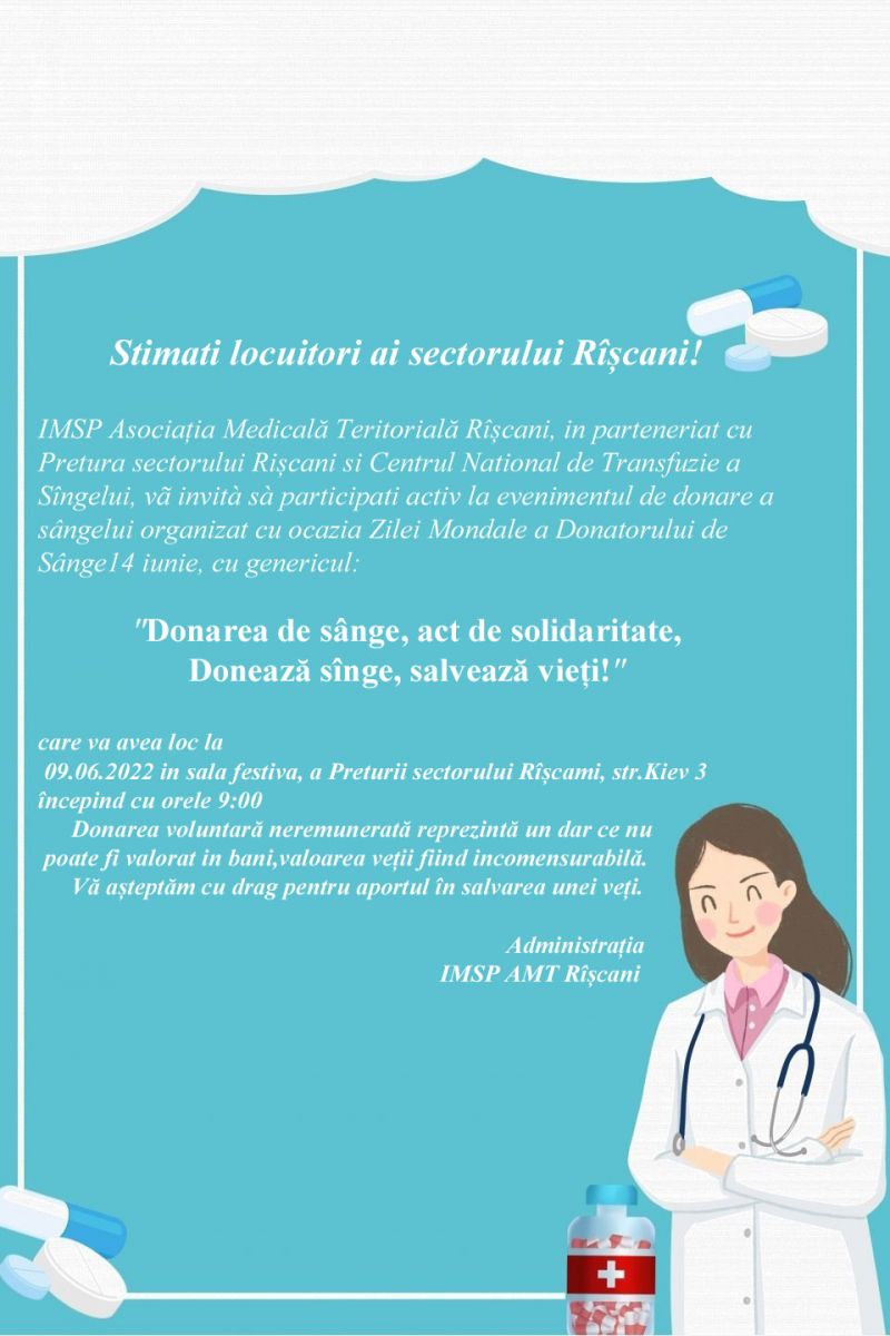 "Donarea de sânge, act de solidaritate, Donează sînge, salvează vieți!"