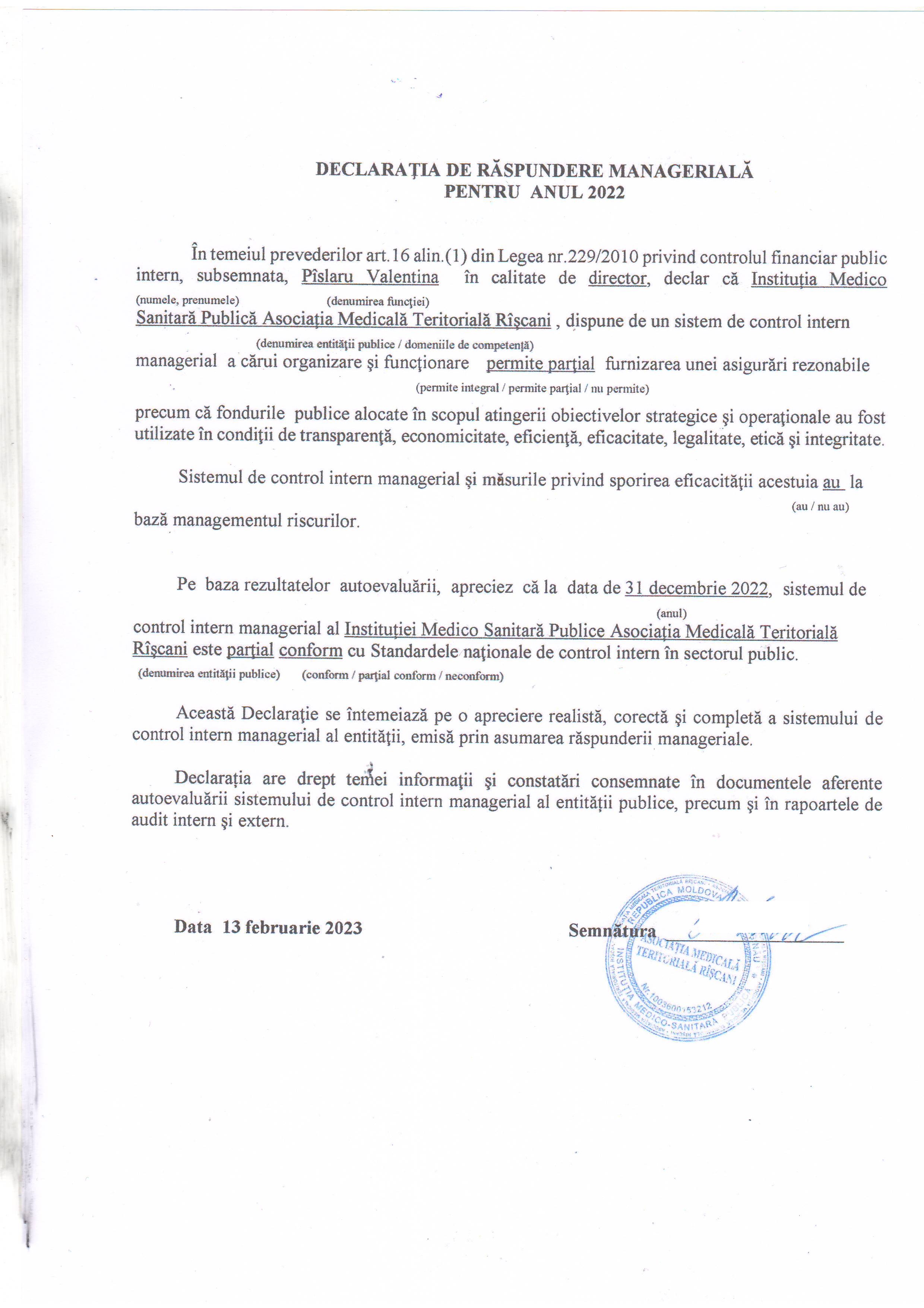 Declarația De Răspundere Managerială pentru anul 2022